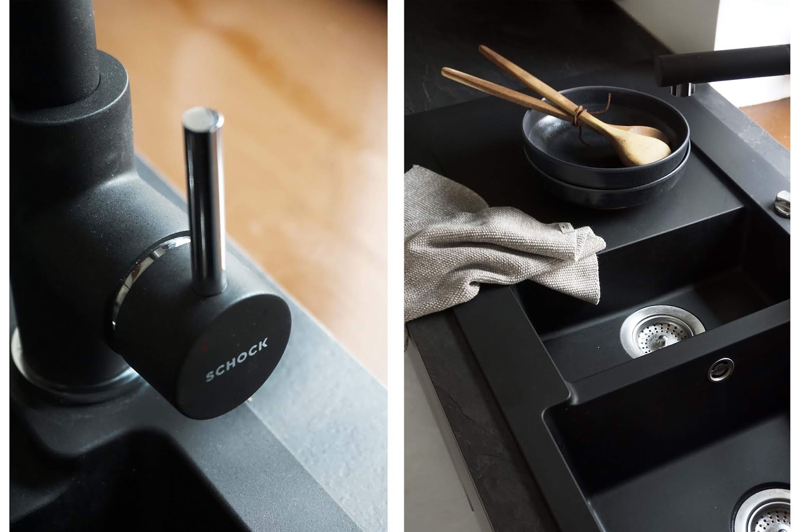 Auch die schwarze Spüle sowie den Wasserhahn haben wir bei otto.de gefunden. Ich bin mehr oder weniger durch Zufall darauf gestoßen und war sehr überrascht, dass otto.de doch so eine wahnsinnige große und vielfältige Auswahl in Sachen Kücheneinrichtung anbietet. Irgendwie hatte ich da nur Fashion im Kopf, aber siehe da... man wird auch manchmal eines Besseren überrascht ;-) Bei der Spüle war es mir sehr wichtig, dass sie diesmal etwas größer ausfällt, natürlich schwarz ist und zwei getrennte Bereiche beinhaltet. So ist nicht nur etwas mehr Ablageplatz, sondern auch optisch integriert sich die Größe sehr gut in unserer neuen Küchenzeile. Der mattschwarze Wasserhahn ist noch das "I-Tüpfelchen", was die Küchendetails angeht.